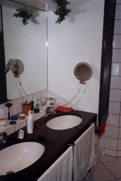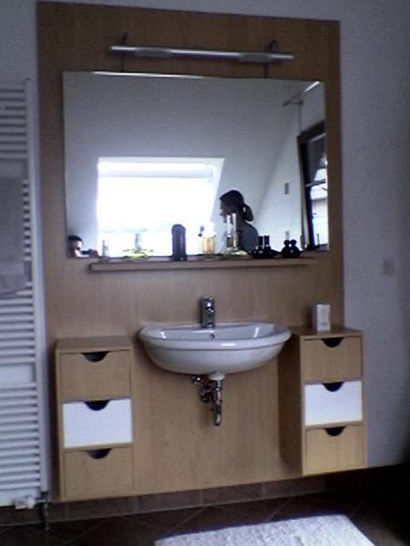 Der Waschplatz besteht aus einer 19 mm Erle beschichteten Spanplatte als Rückwand. Zwei vorgesetzte Schränkchen mit drei Schubladen. Aufgeklebtem Spiegel und Leuchtstoff Lampe.