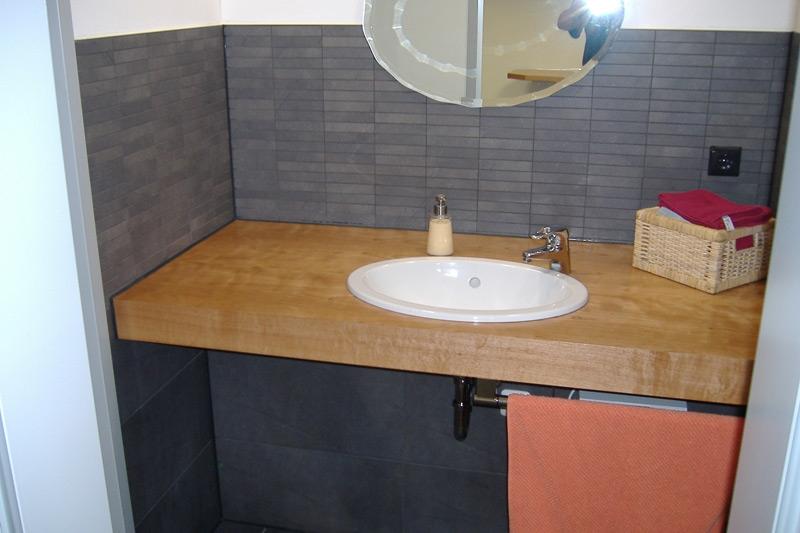 Der Waschtisch besteht aus Tischlerplatte mit einem eingesetzten Waschbecken. Die Platte wurde mit Black Cherry furniert und transparent lackiert. Es wurde vor Ort an die Nische angepasst und versiegelt. Maße: 122 x 70 cm
